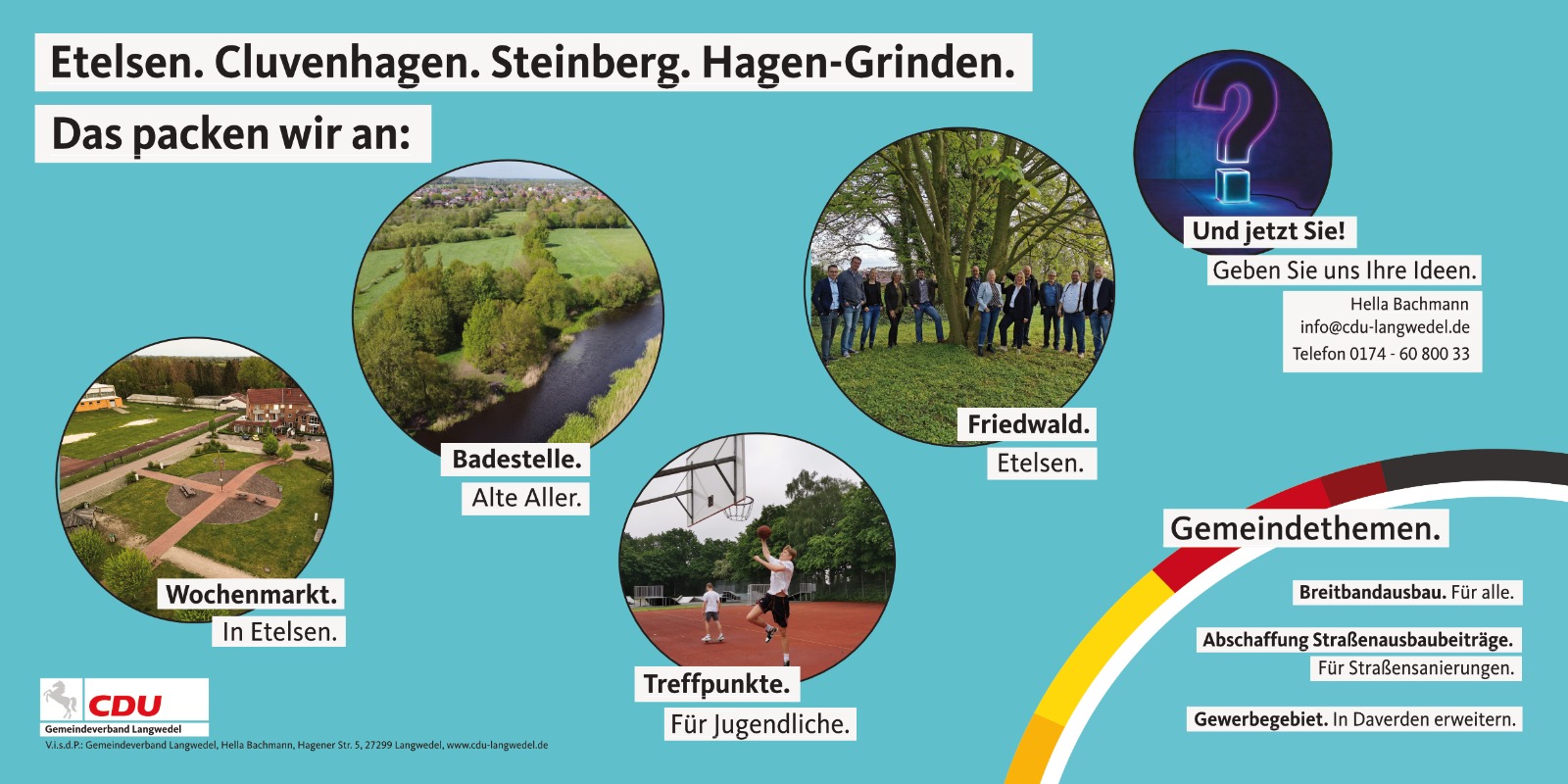 Dafür machen wir uns stark! Für Etelsen, Cluvenhagen, Steinberg und Hagen-Grinden. Empfehlen Sie uns!Bei Facebook teilen Bei Twitter (X) teilen Bei Whatsapp teilen Diese Seite drucken Diese Seite einem Freund schicken